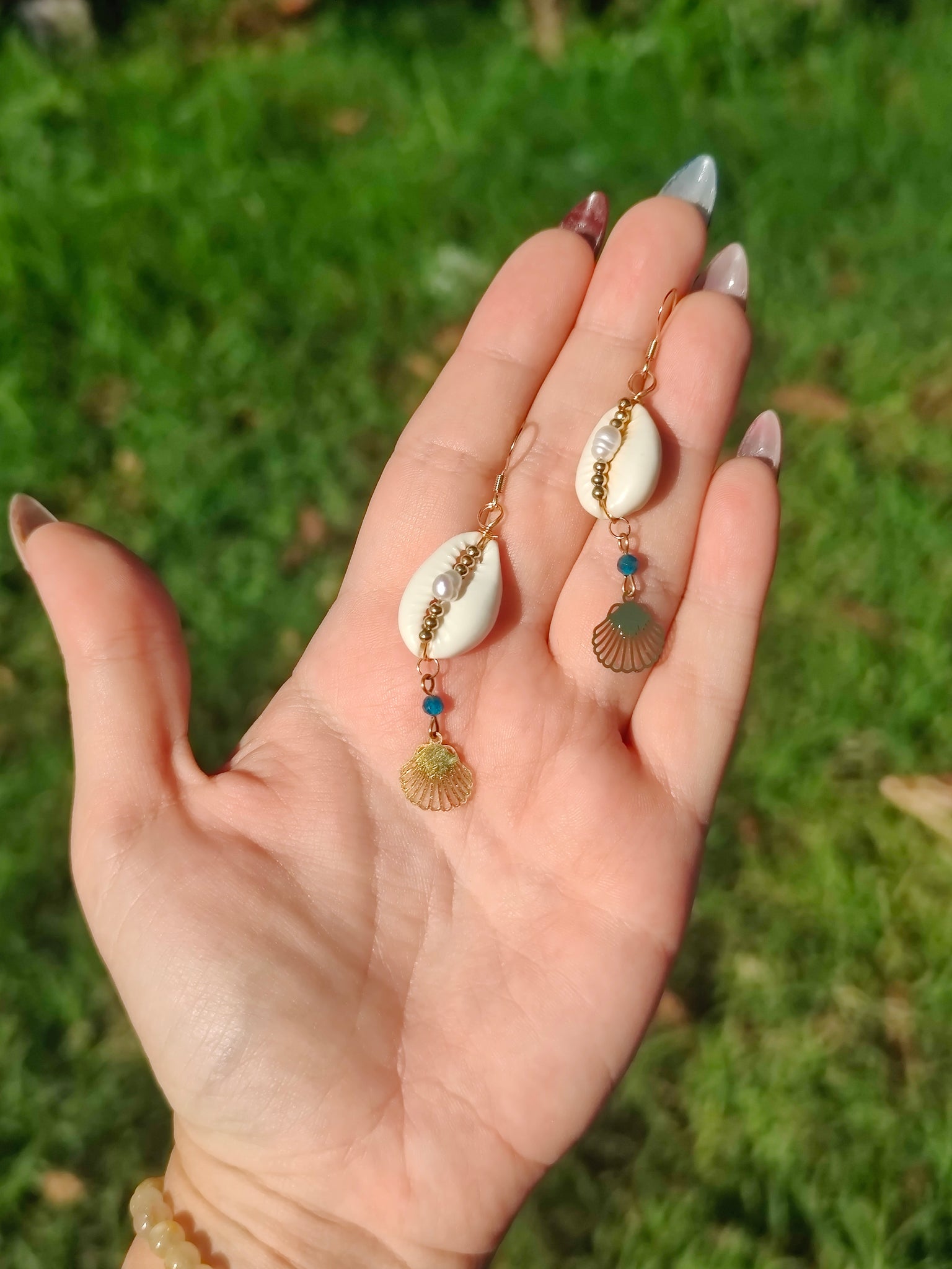 Les boucles Sedna, symbole de l'appel de la mer, sont habillées de véritables coquillages ornés de perles connectés à des apatites bleus d'où pendent d'autres coquillages.