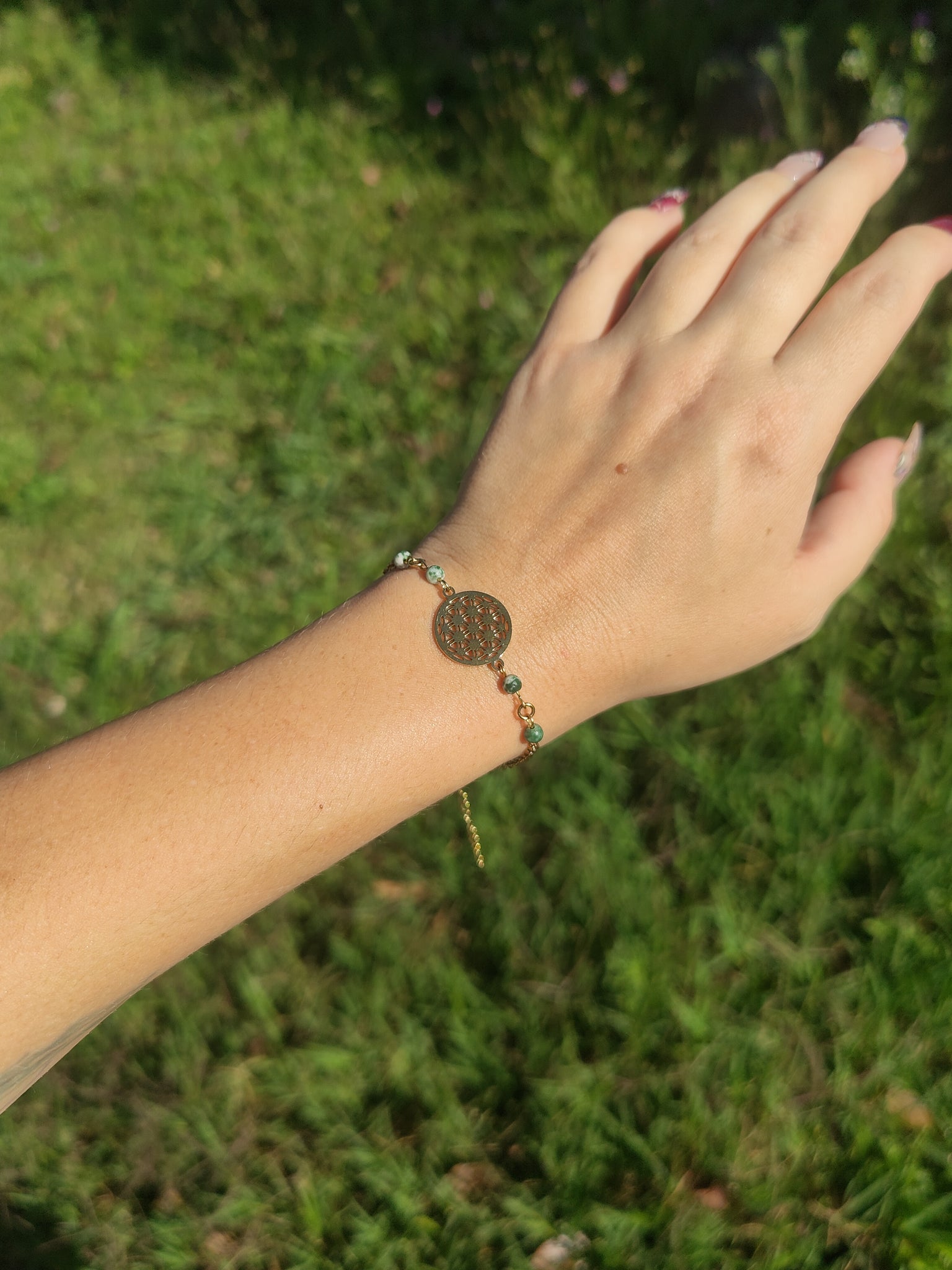 Ce bracelet avec une fleur de vie est connectée à des perles d'agate arbre, pierre de nature et de renouveau !