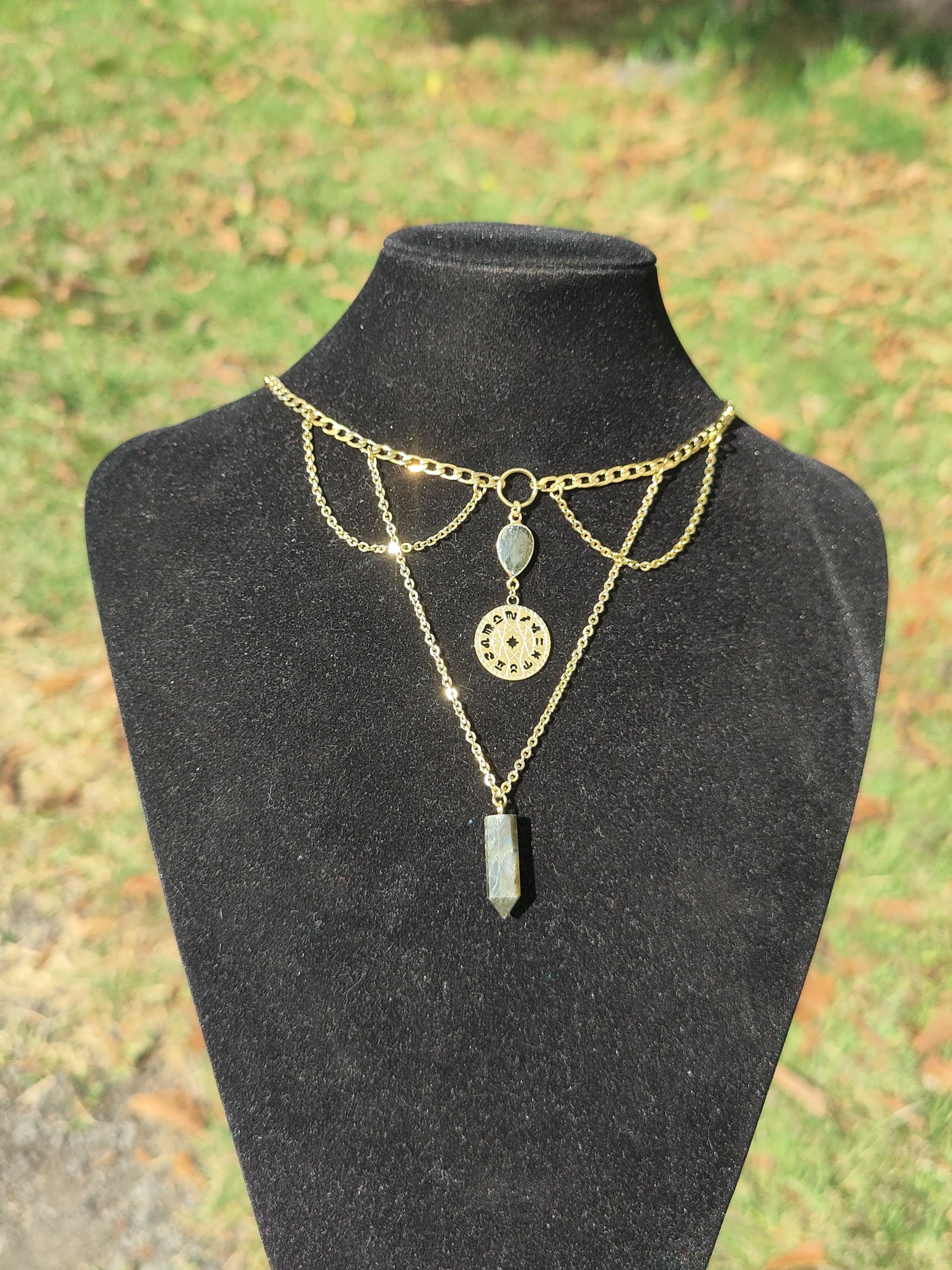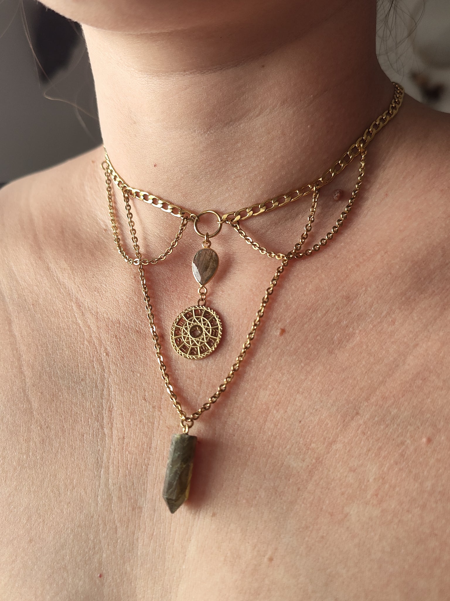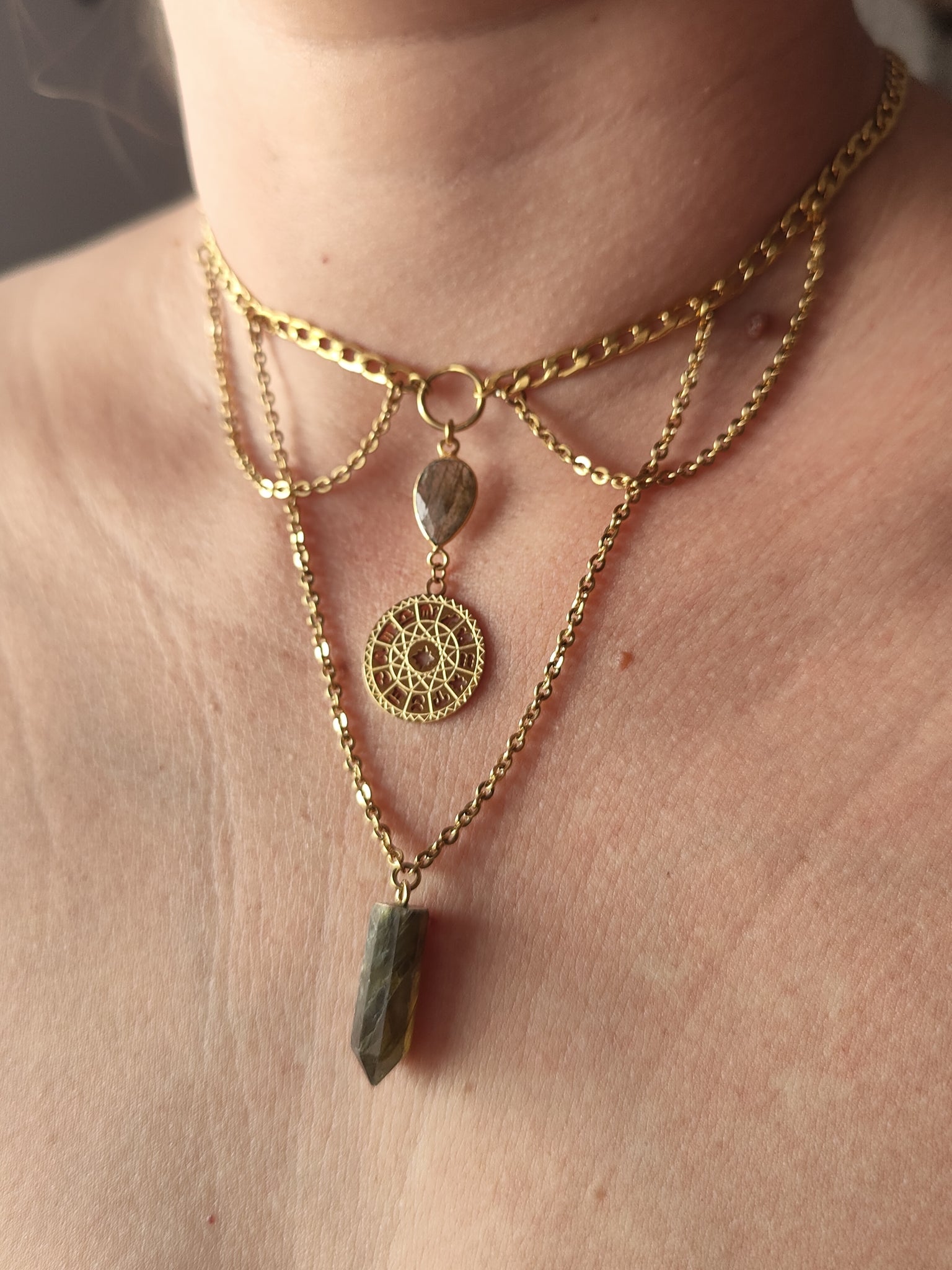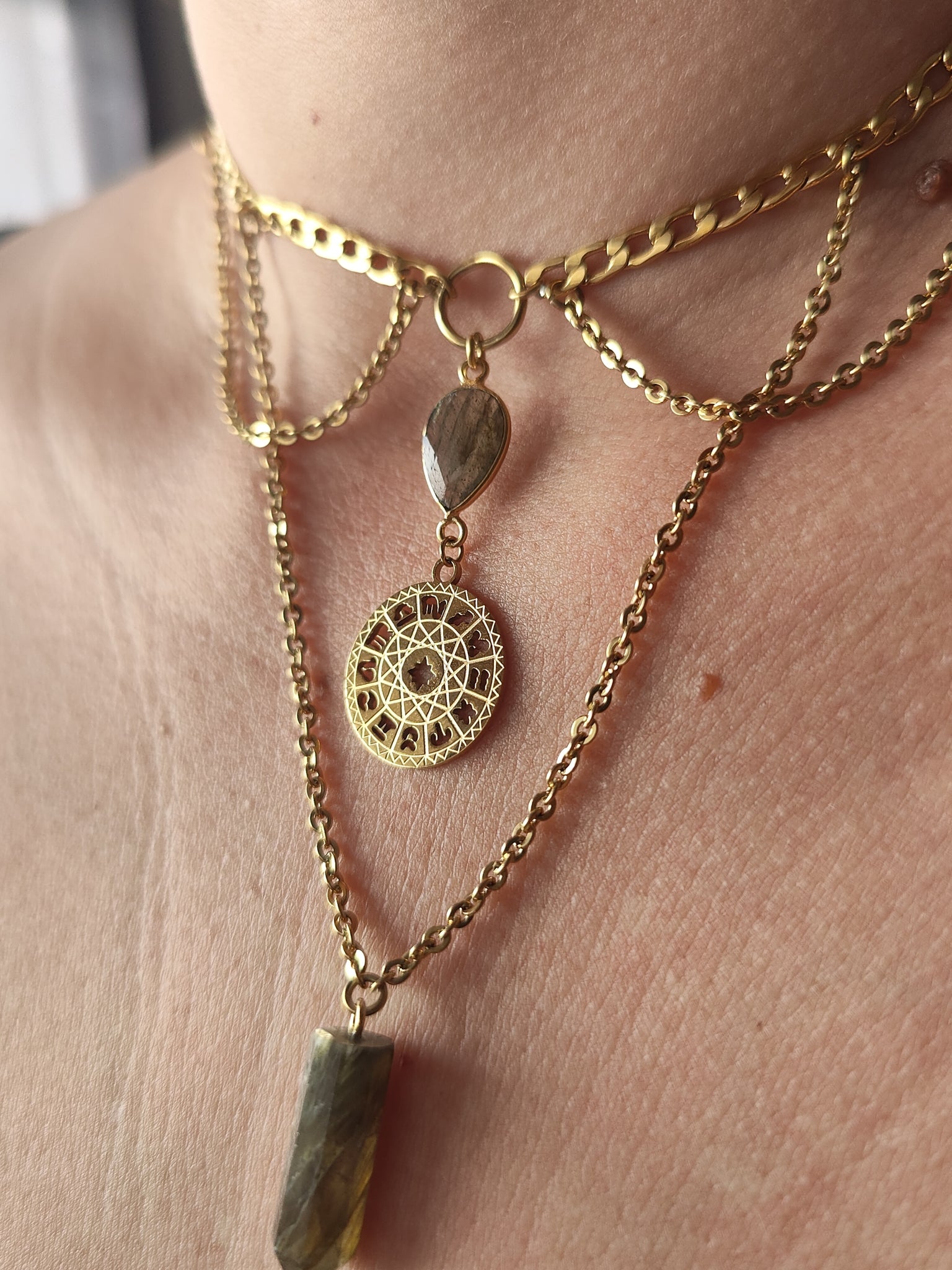 Olympia rappelle l'univers, le cosmos et les planètes. Ses pendentifs en labradorite aux reflets bleutés représentent l'intuition et la connexion avec le divin. Accompagné de son pendentif roue du zodiaque, ce collier est fait pour les fans de mythologie, d'astrologie et de voie lactée.
