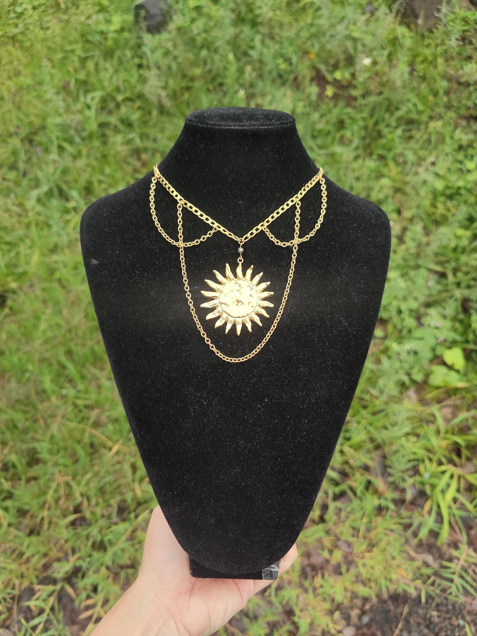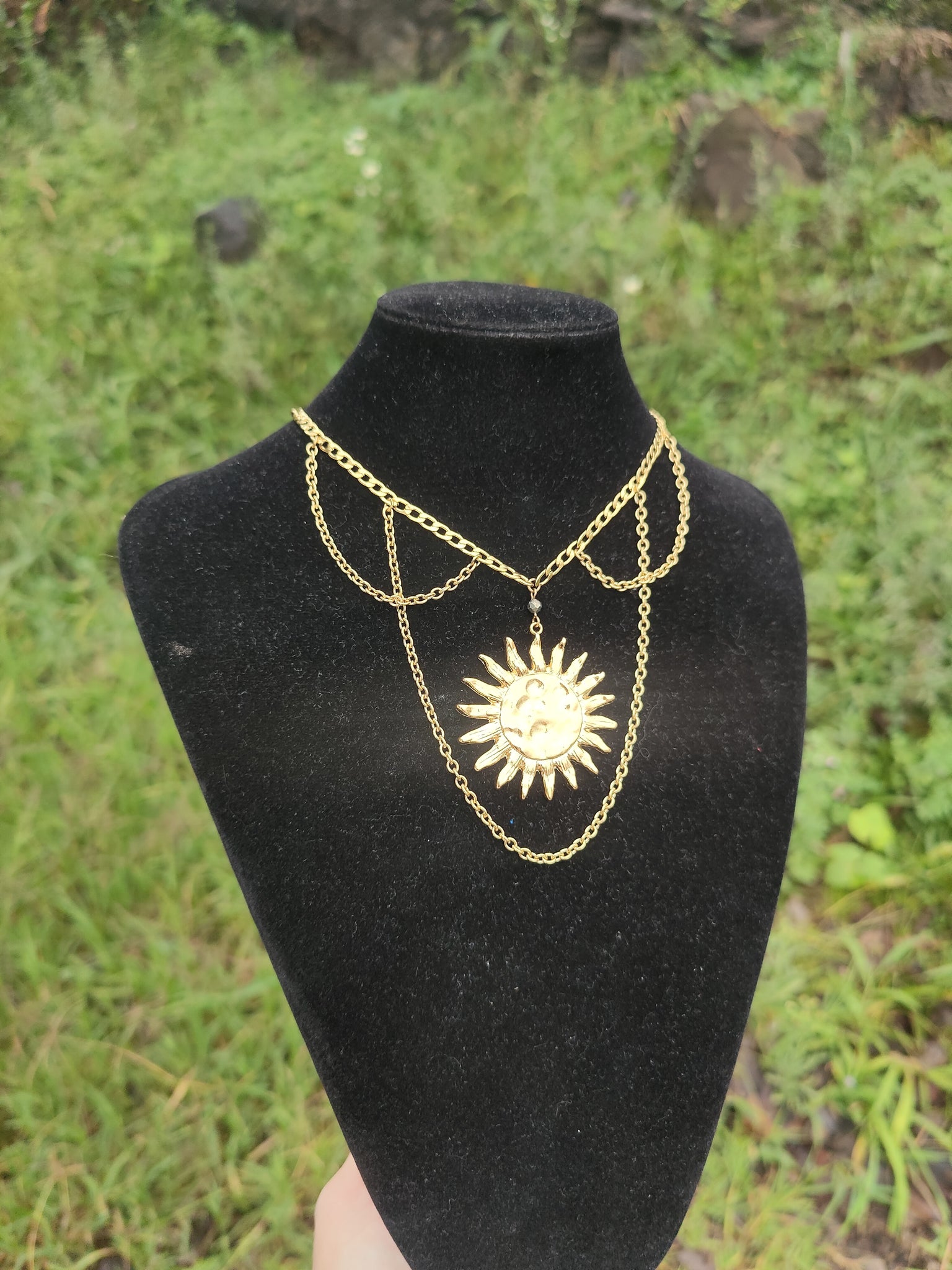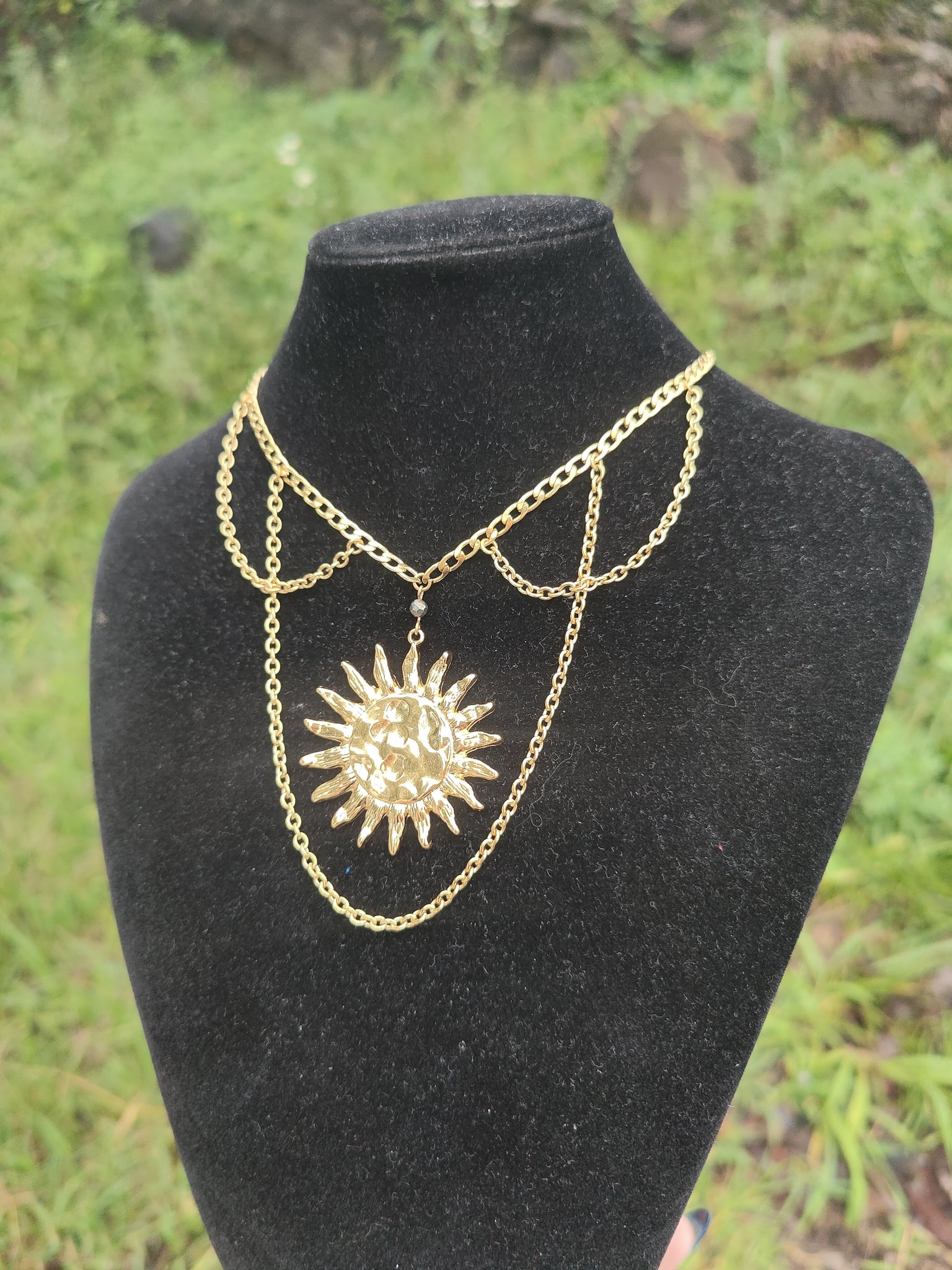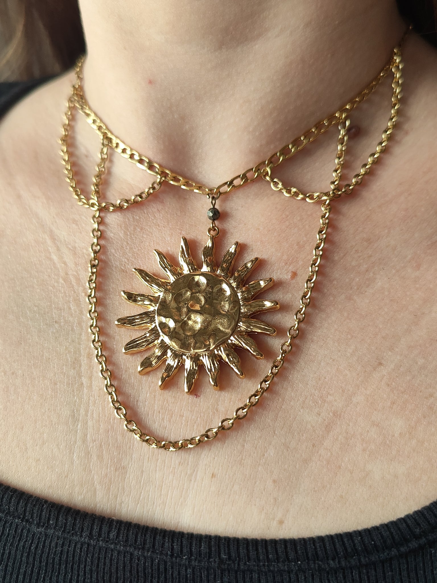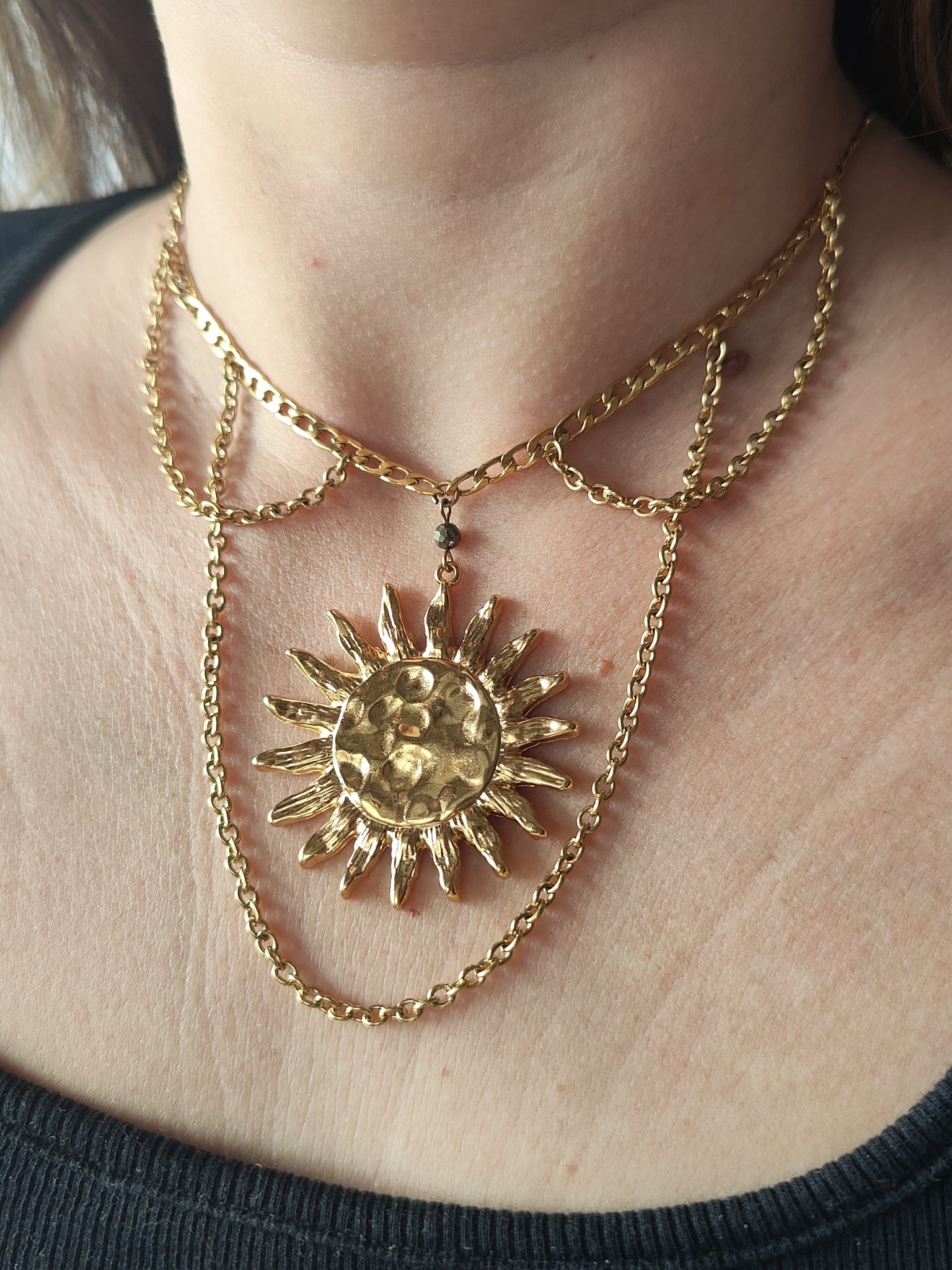 Isadora est un collier solaire de reine: affichez votre pouvoir et votre lumière sans peur et sans gène ! La pyrite apporte une touche de brillance au soleil et à sa chaîne dorée en acier inoxydable.