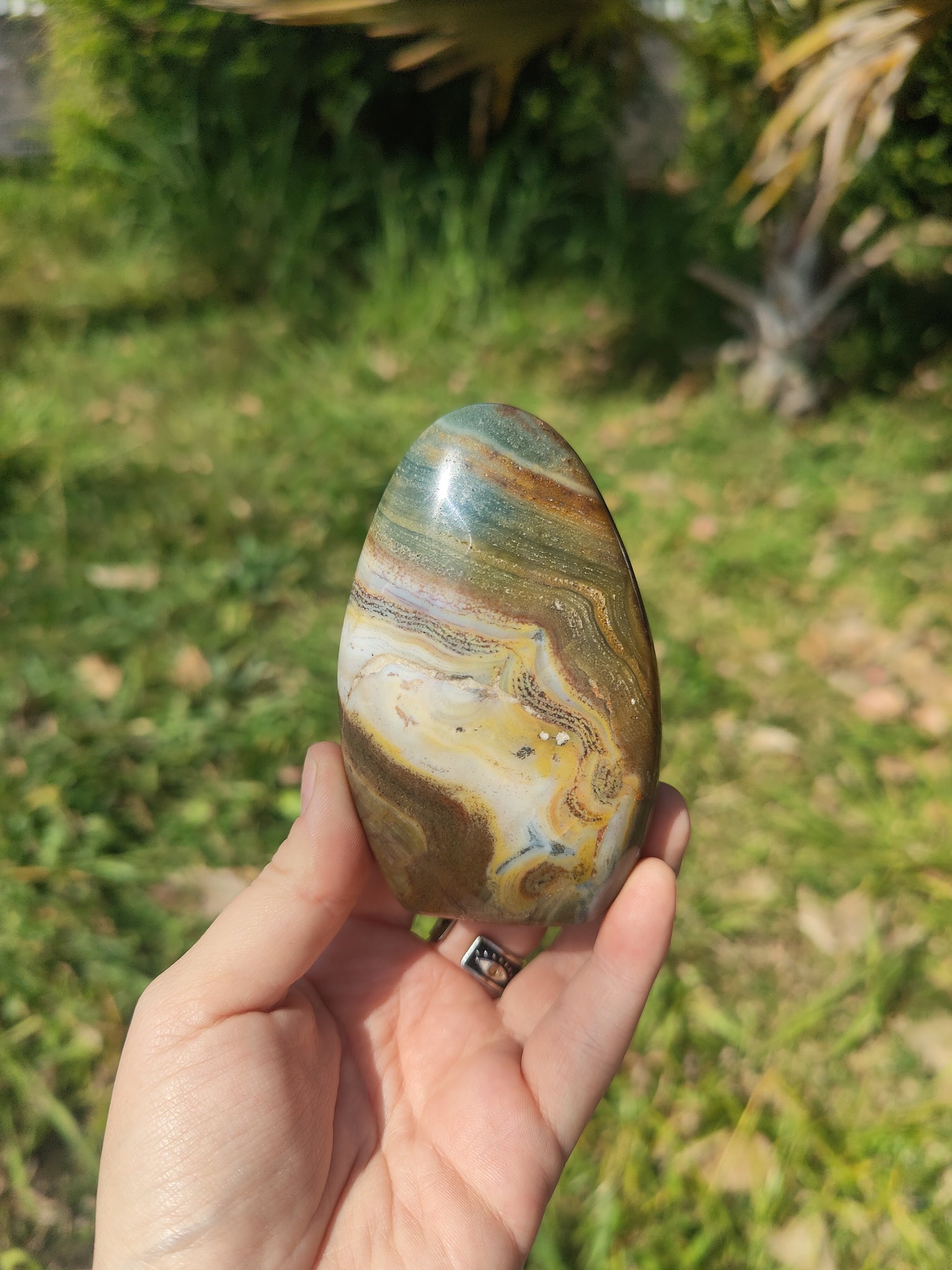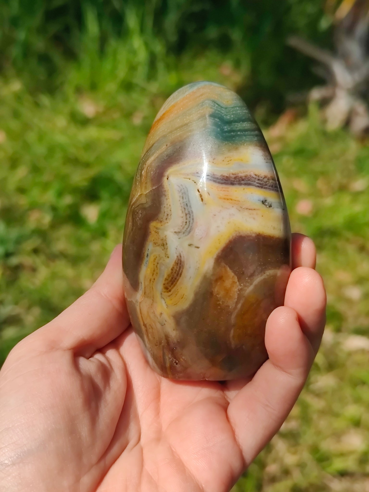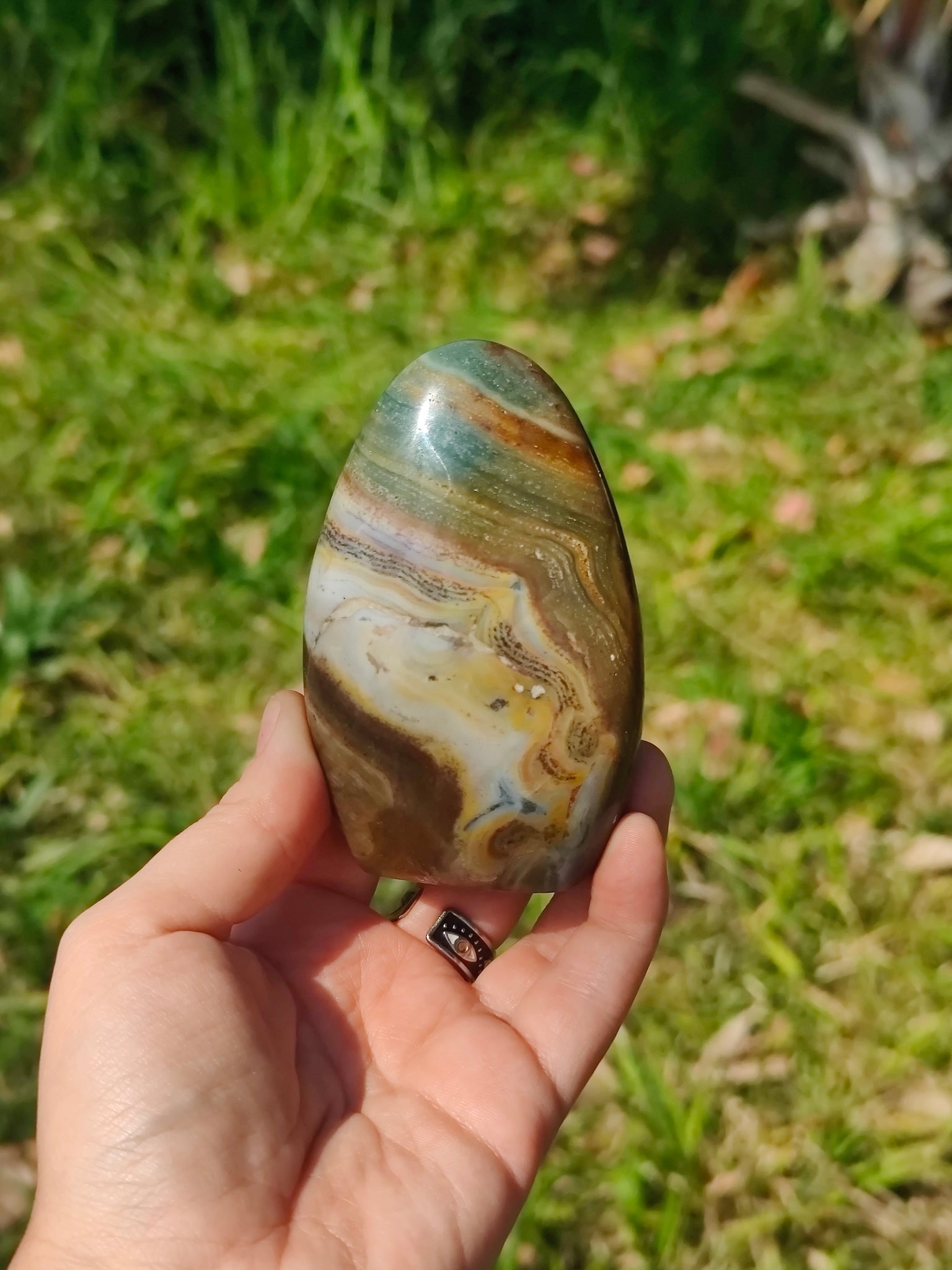 Symbole de paix intérieur et de spiritualité, cette forme unique en jaspe orbiculaire (également appelé jaspe océan) fascine de part ses couleurs et ses vertus apaisantes.